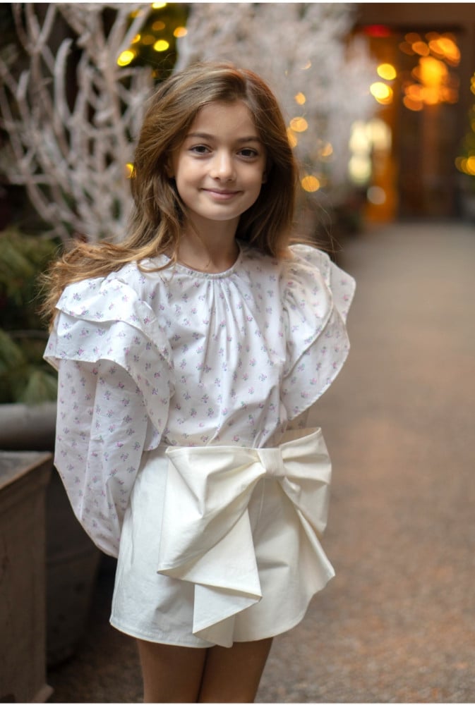 Add a touch of elegance and innocence to your little one's look with this white shorts set featuring a large bow and a ruffled top . Its unique, modern design will give your child a beautiful and comfortable look for special occasions and everyday wear.