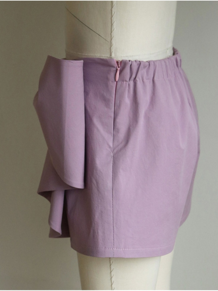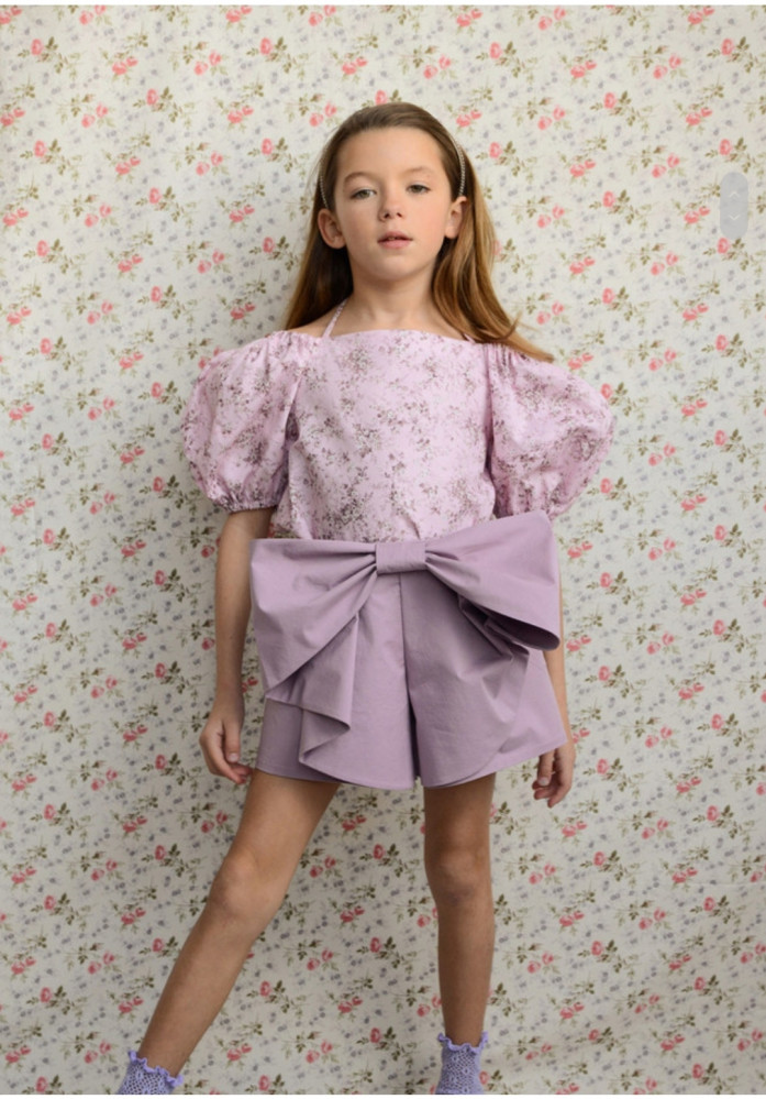 A set of lavender shorts with a large bow and a lavender floral top
